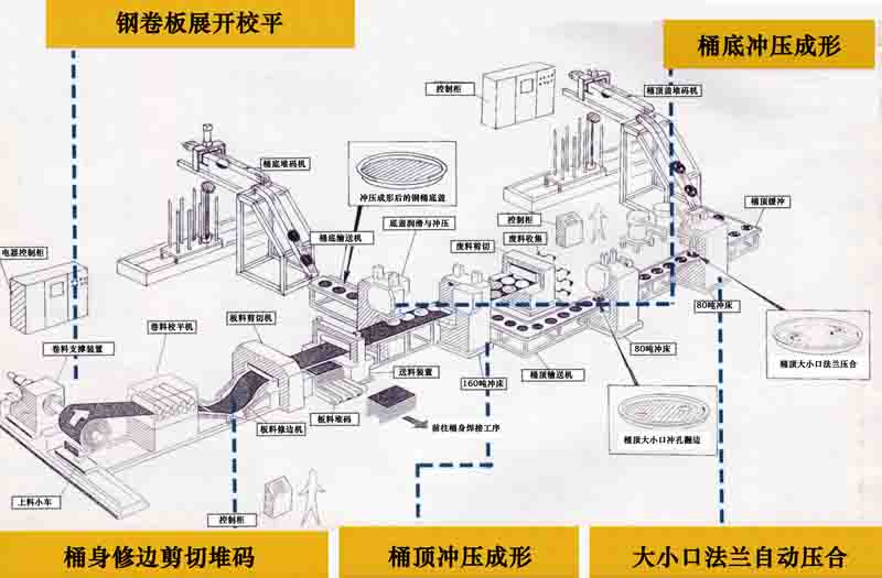 制桶機(jī)械是指能完成全部或部分鋼桶產(chǎn)品的的生產(chǎn)機(jī)械。生產(chǎn)過程包括開卷下料、底蓋沖壓、封閉器壓合、縫焊、桶身成形、卷邊封口、清洗磷化、噴漆、涂層干燥等多個(gè)工序,以及與其相關(guān)的前后工序,譬如預(yù)卷注膠、檢驗(yàn)、標(biāo)志印刷和堆碼等操作。此外,制桶還包括鋼桶稱重或在鋼桶上蓋印、貼標(biāo)等工序。使用制桶機(jī)械可提高生產(chǎn)效率,降低勞動(dòng)強(qiáng)度,適應(yīng)大規(guī)模生產(chǎn)的需要,并滿足清潔衛(wèi)生的要求。因此選擇一款優(yōu)質(zhì)的、適合自己使用的制桶機(jī)械就顯得極其重要。